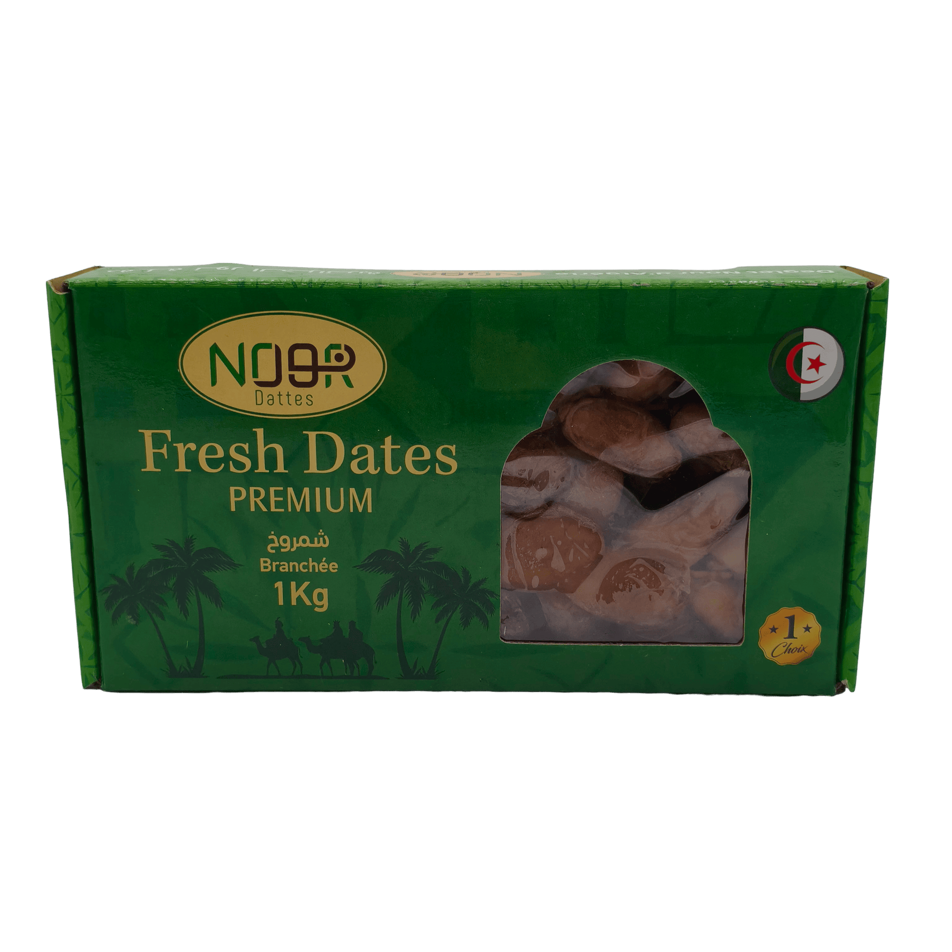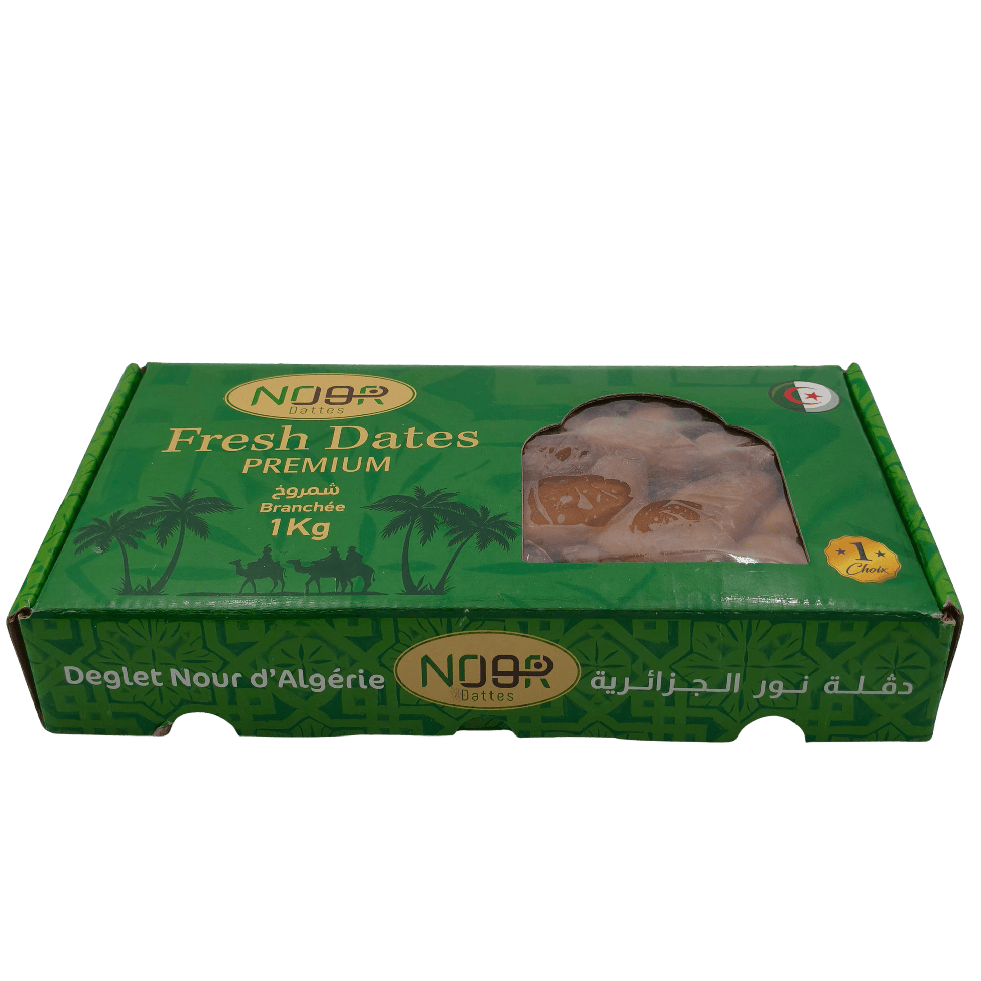 Nos Dattes Deglet Nour NoorSelection en branche de 1 kg proviennent directement des palmeraies de Tolga (Biskra, Algérie), où elles sont récoltées avec soin afin de préserver leur fraîcheur et leur aspect naturel.